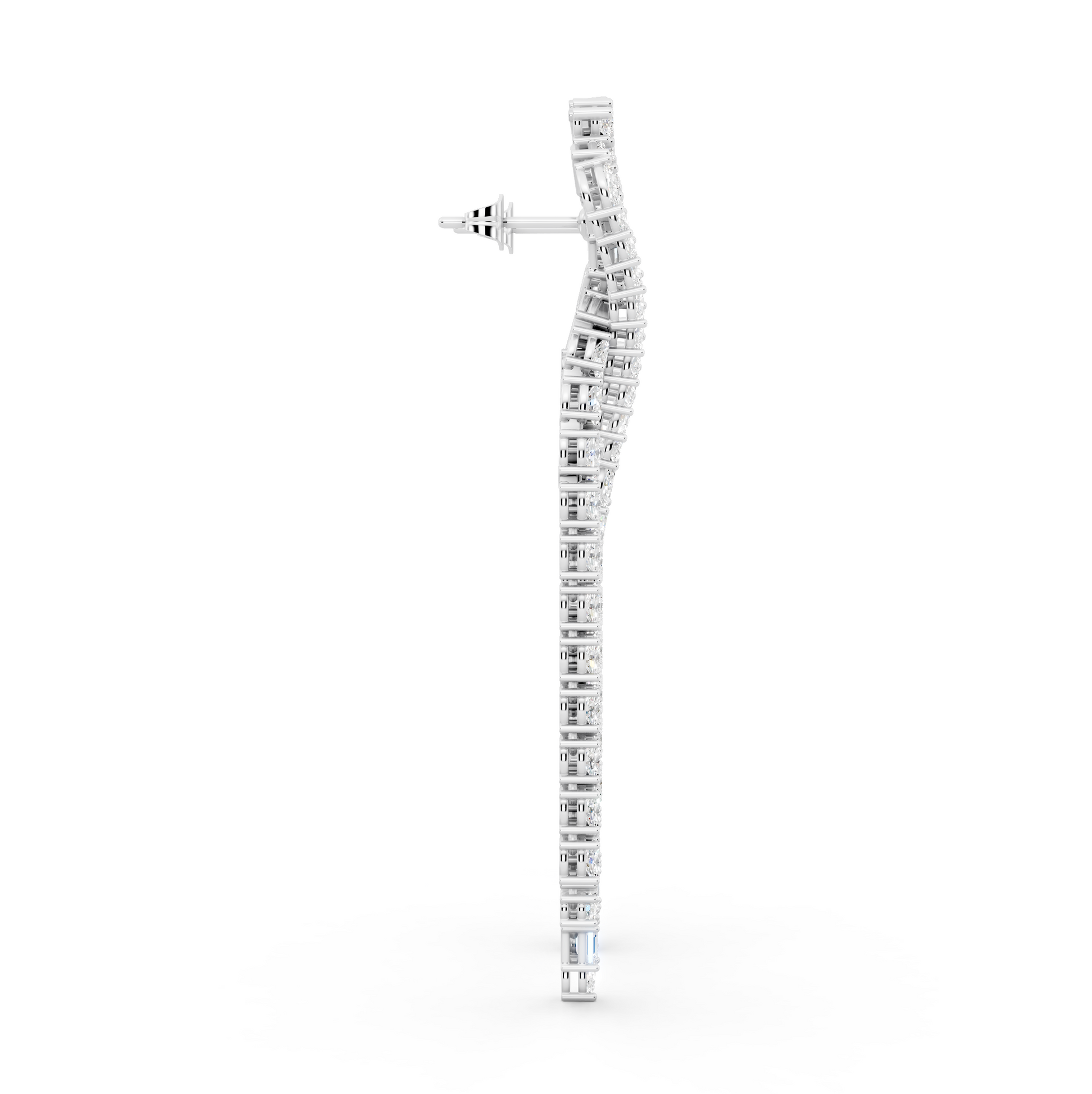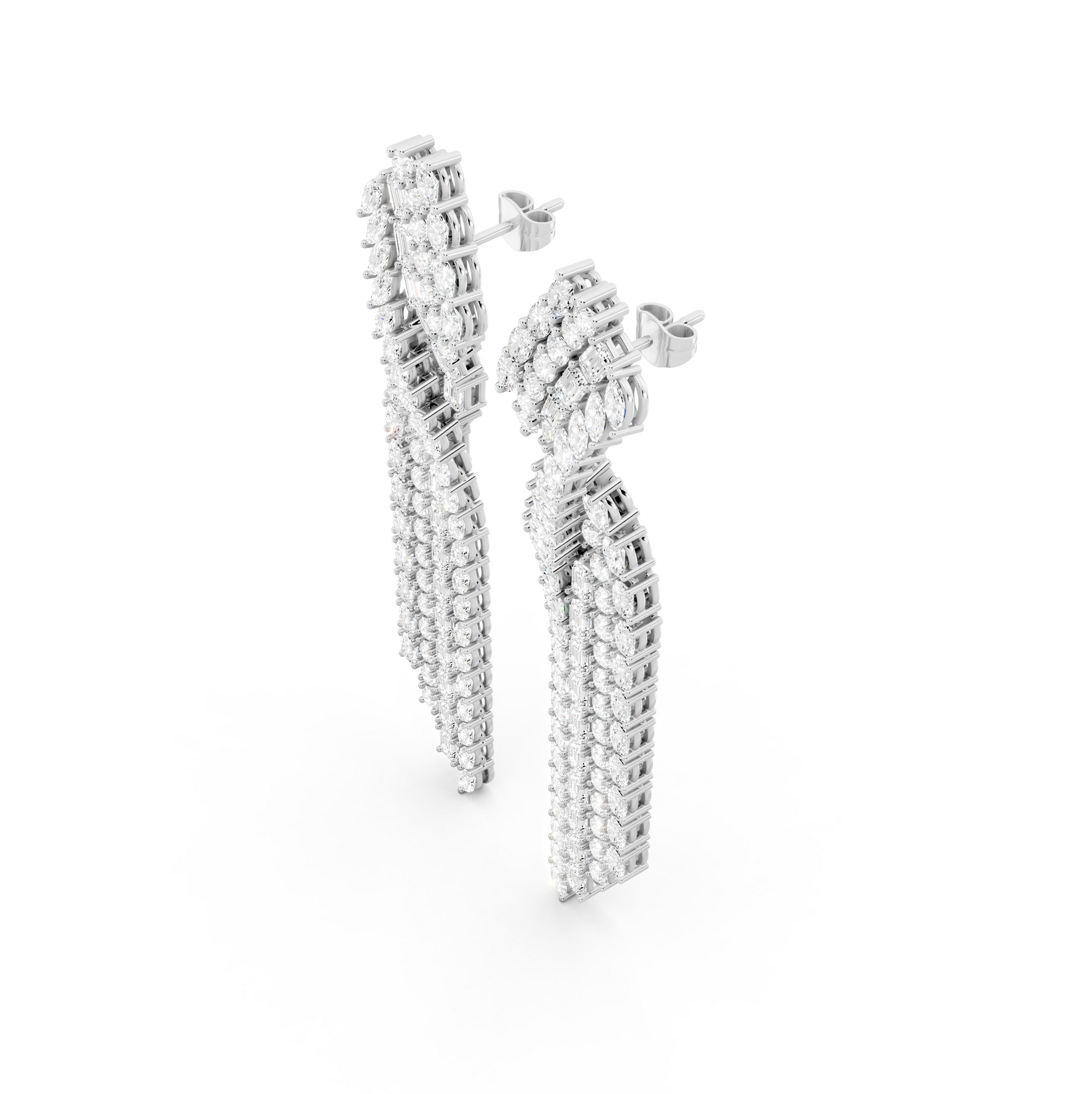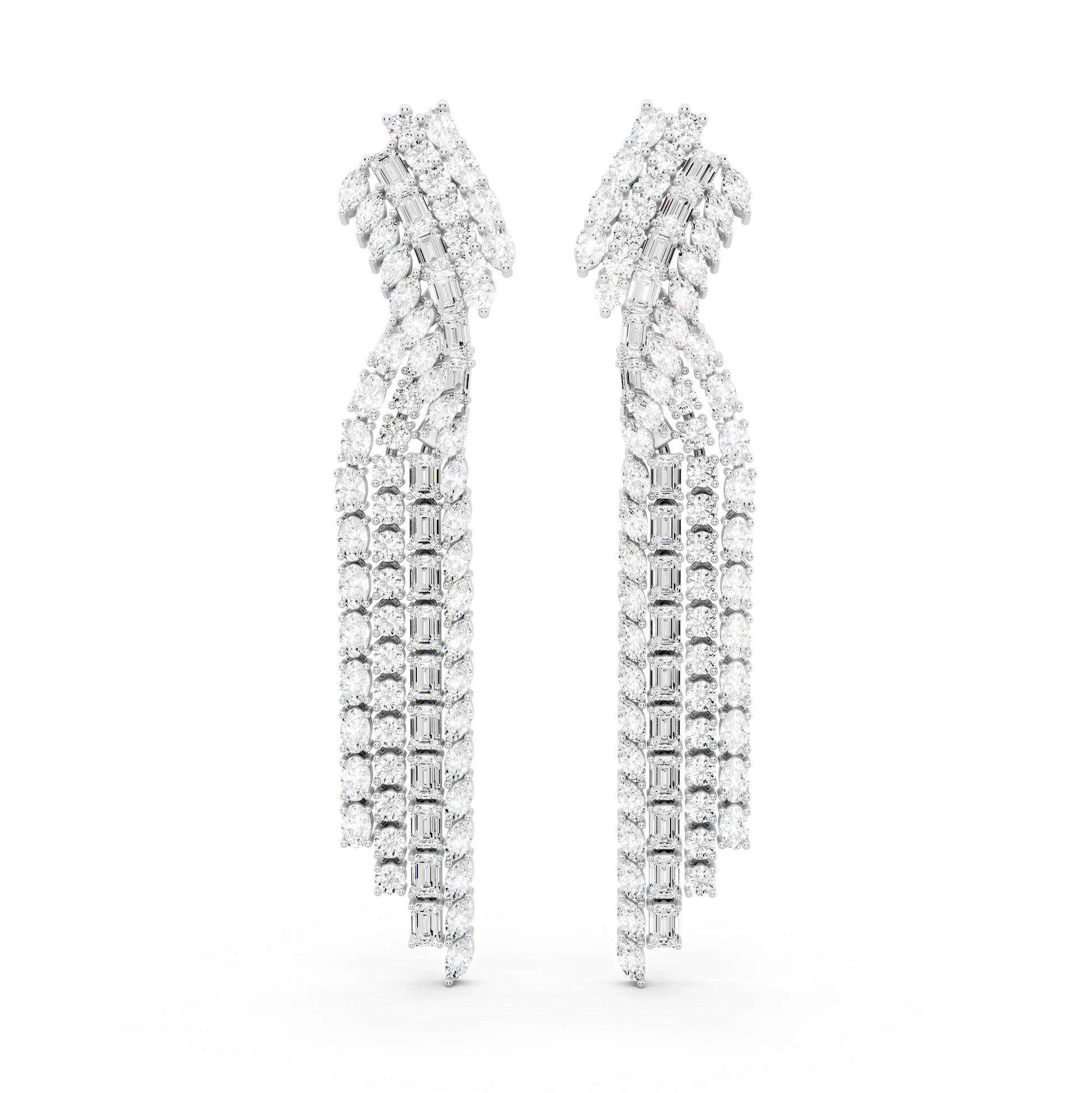 The Unspoken Earrings are defined by cascading diamonds arranged in a deliberate, elongated form. The layered mix of round and baguette cuts creates movement without excess, allowing light to follow the natural line of the face. Designed to command presence quietly, it reflects expression that doesn’t require explanation.