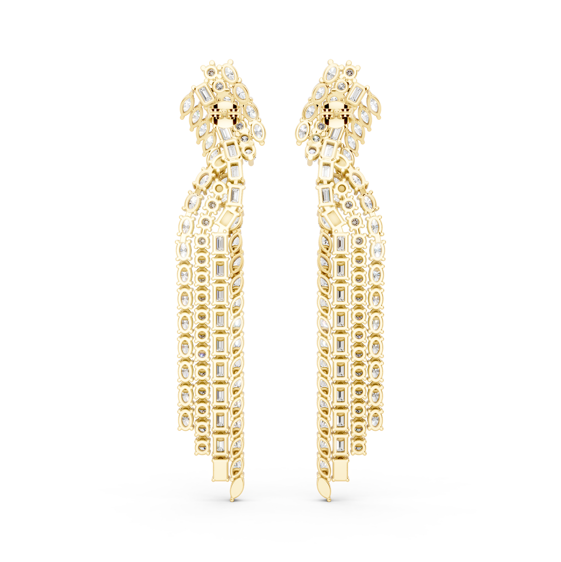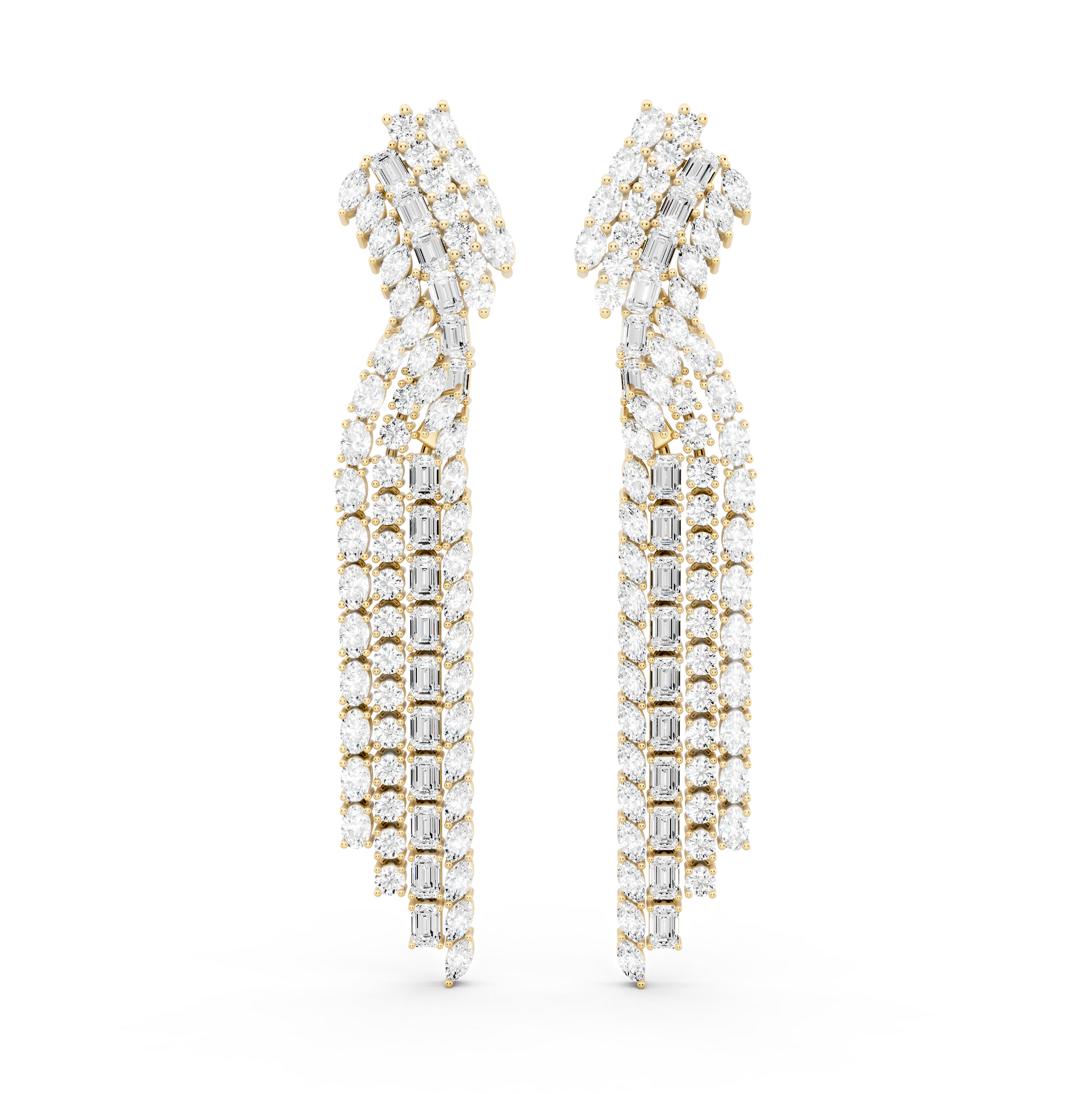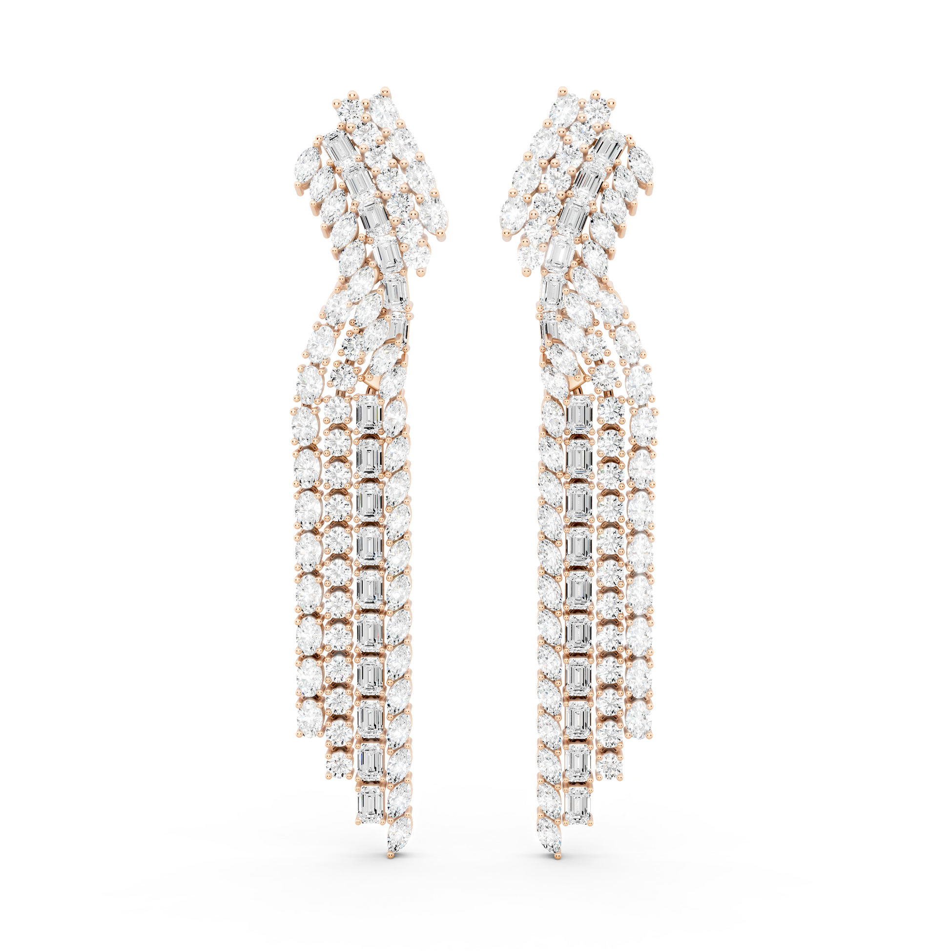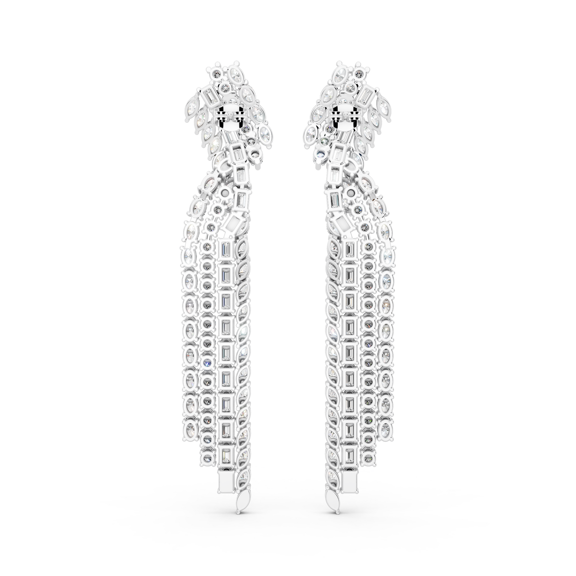 The Unspoken Earrings are defined by cascading diamonds arranged in a deliberate, elongated form. The layered mix of round and baguette cuts creates movement without excess, allowing light to follow the natural line of the face. Designed to command presence quietly, it reflects expression that doesn’t require explanation.